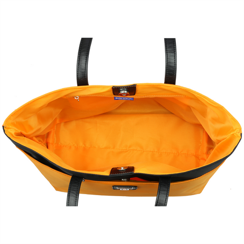 An Iconic style tote that's timeless! This spacious and durable mid-sized Tennessee tote displays the Tennessee Volunteers logo as a raised solid metal piece finished with enamel in the team color. Designed with a two toned nylon material, faux leather straps and magnetic snap closures at the top and exterior pocket. Fits laptops, books, wallets and lunch! Use it for school, work or everyday. Measures 17"L at its longest point x 11"H x 7"W.