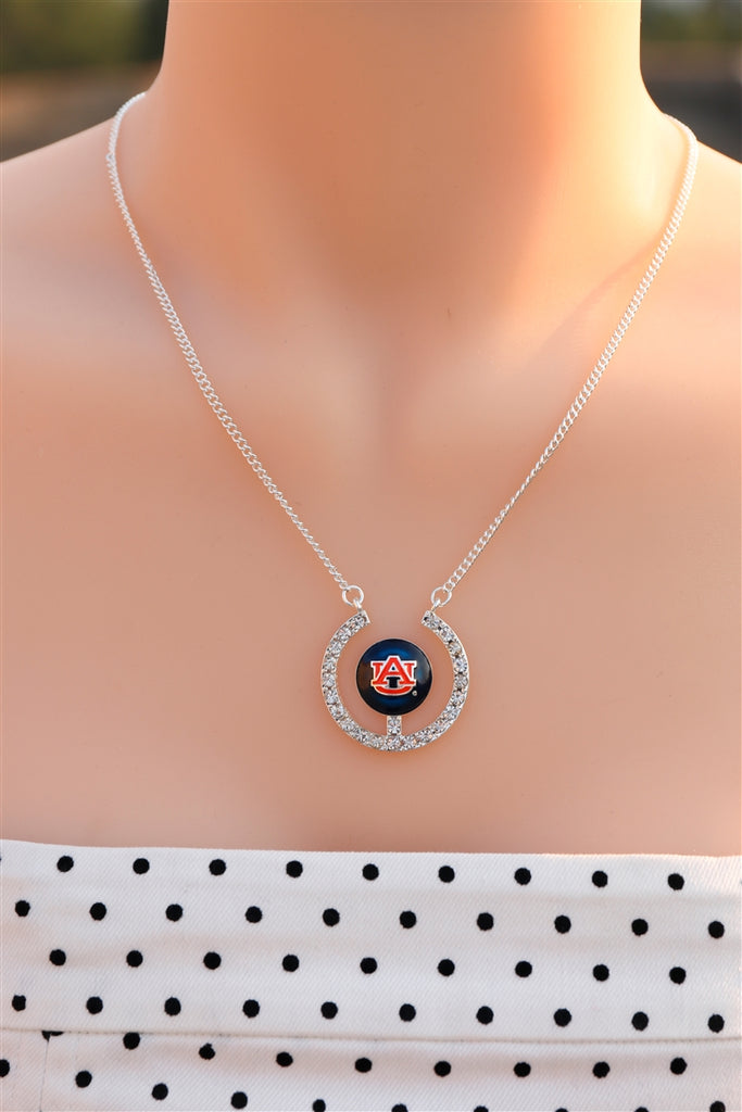 This necklace has AU in the center in team colors. It has an open circle with small rhinestones around it.